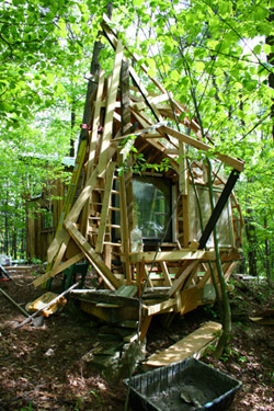 Matt Bua's recent work takes form in large–scale elements in architecture that are both functional and fantastical. These spaces are created out of found objects and other sustainable resources. Bua’s present project is the construction of small–scale examples of vernacular, experimental, and visionary architecture on a piece of land in Catskill NY. Each structure focuses on specific themes and usages that are integrated into the surrounding community. The land obtained for this project contains the peak of Vedder Mountain, which is named after Jessie Van Vechten Vedder, New York State’s first female historian, and author of the History of Greene County. A Vedder Mountain Summit house is in the works.