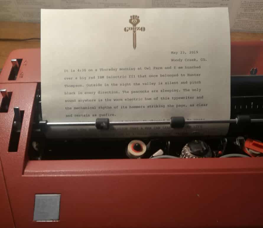 One morning, George, Brian and I were able to get a peek inside Denis’ office, which was in its own small outbuilding overlooking a pond. He was one of those writers who faced a window, and the nearest wall was clustered with clippings and notes. He had handwritten a quote of Emerson’s at just about eye-level that read, ‘God will not let his work be made manifest by cowards – Self-Reliance.’